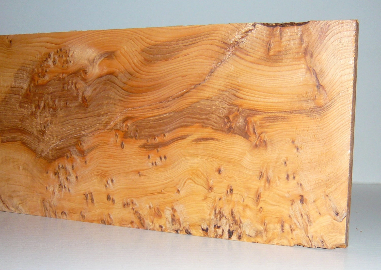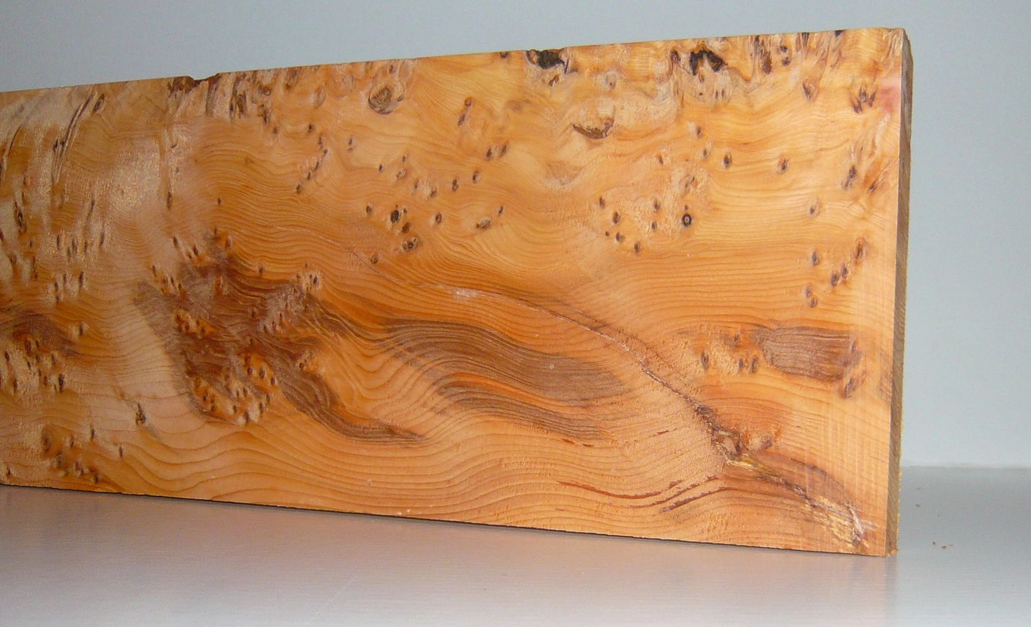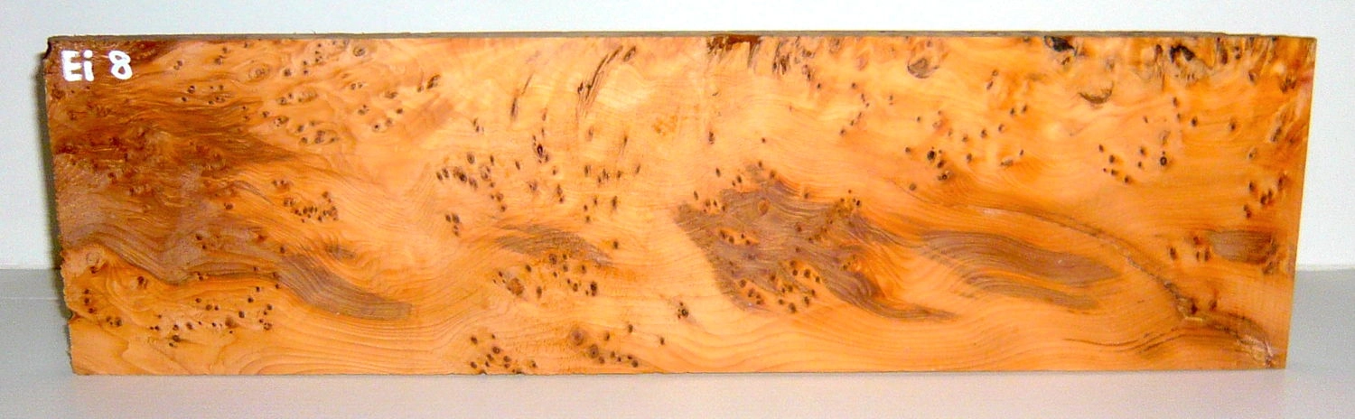 Eiben (Taxus baccata) wachsen in weiten Gebieten Europas, in England werden die Bäume seit Jahrhunderten wegen ihres u.a. für den Bogenbau wertvollen Holzes kultiviert. Eiben können über 1000 Jahre alt werden. Schönes, mit feinen kleinen schlafenden Augen genannten Knospen überwachsenes Holz wird als 'gepfeffertes' Maserholz bezeichnet, ist äußerst selten und begehrt für feinste Möbel und Drechselarbeiten! Das Holz der Eibe ist sehr hart, zäh, schwer, höchst elastisch und auch bei Feuchtigkeit sehr dauerhaft. Eibe hat das härteste Holz aller Nadelhölzer. Es lässt sich mit allen Werkzeugen leicht und gut bearbeiten, gehobelte Flächen werden sehr glatt. Fazit: Ein seltenes, nicht alltägliches Edelholz! Maserholztypische kleine Fehlstellen wie Rindeneinwüchse, Stiftästchen, Wirbel, Haarrisse u. ä. können problemlos und sehr schnell mit dünnflüssigem Sekundenkleber gefüllt werden.